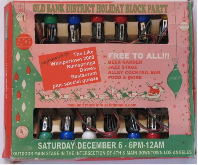 This Saturday night we celebrate the holidays with downtown businesses by shutting down Main St (between 4th & 5th) and Spring St (between main & spring). Little Radio is hosting the Main Stage at the intersection of 4th and Main with live performances from The Like, Whispertown 2000, Rumspringa, Dawes, Restavrant, and others.